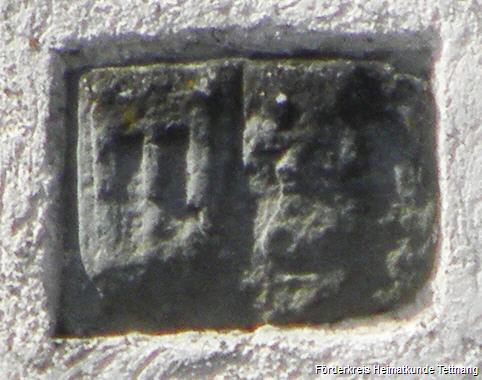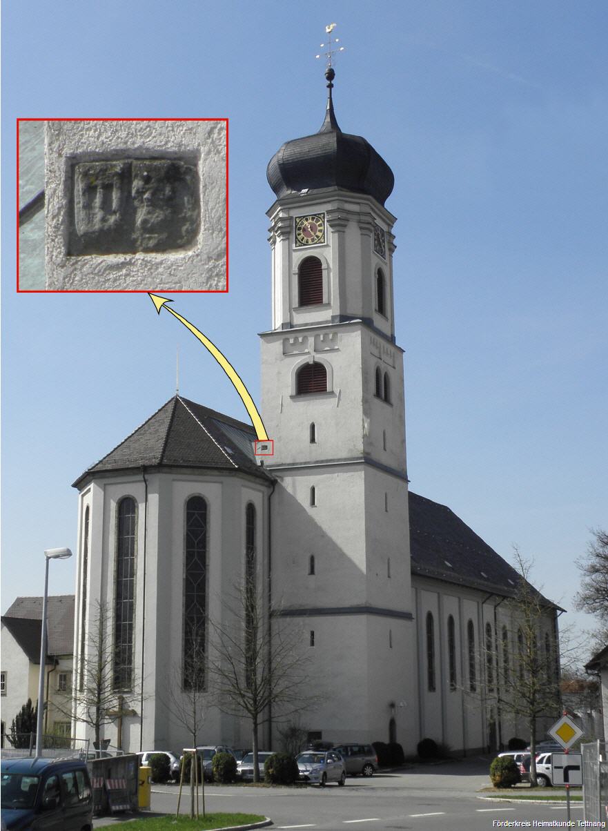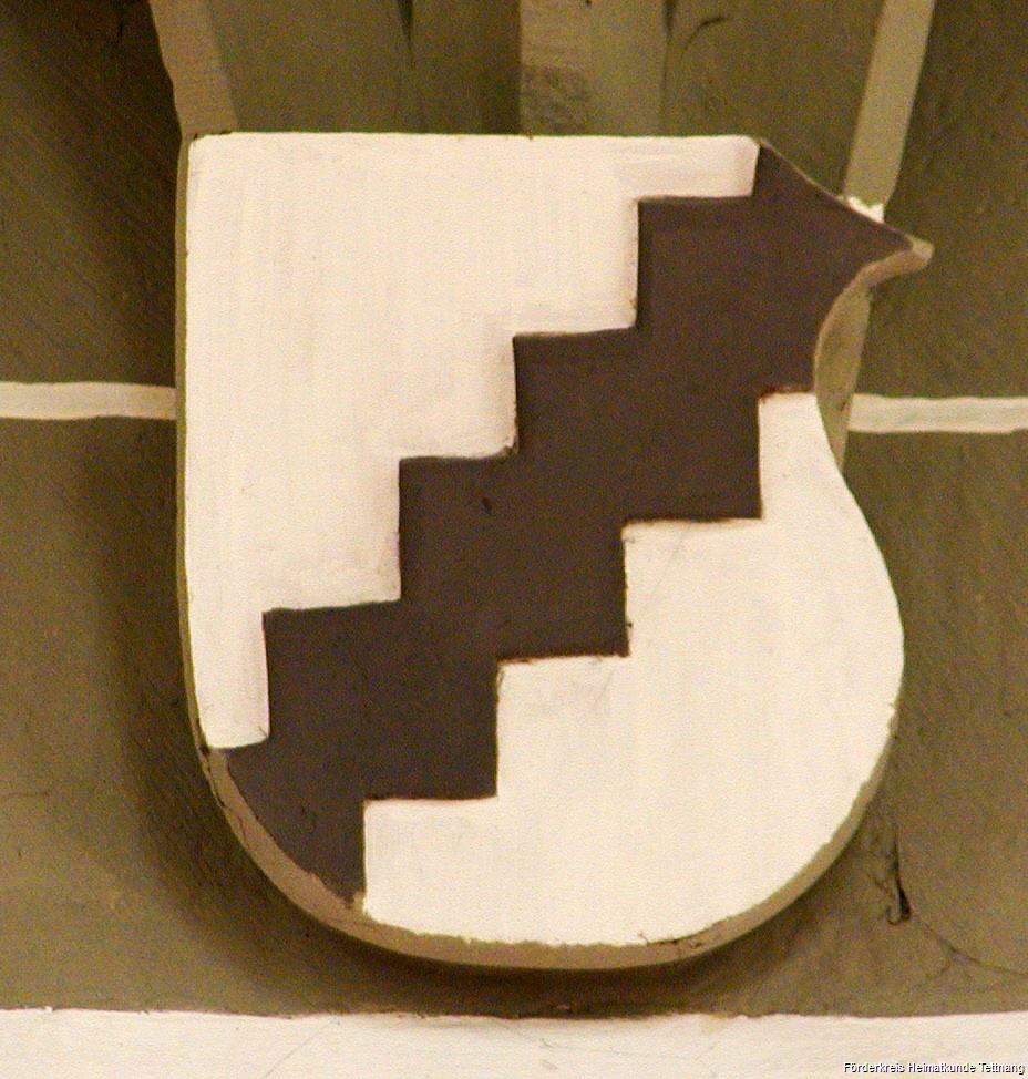 Auf einem verwitterten Sandstein am Turm der St. Gallus-Kirche in Tettnang befindet sich ein Allianzwappen Montfort/Werdenberg-Heiligenberg. Es ist von unten nur als unverputzter Fleck etwa in Höhe des Dachansatzes zu sehen (Abb. 6) und in einem so schlechten Zustand, dass es bei Restaurierungsarbeiten 1992 zunächst viele Rätsel aufgegeben hat. Deutlich zu erkennen ist auf dem Stein links das Wappen der Grafen von Montfort (Abb. 7). Da es sich bei der Anordnung von zwei nebeneinanderstehenden Wappen um ein Allianzwappen handelt, kann das rechte Wappen nur das der Gemahlin eines Montfortgrafen sein. Und tatsächlich lassen die spärlichen Reste des Schildes einen Zick-Zack-Balken (Stufenschrägbalken) erkennen: das Wappen der Grafen von Heiligenberg, (Abb. 8). Als Graf Ulrich V. von Montfort 1467 den Grundstein für die Galluskirche setzte, stand der Turm bereits. Seine Eltern waren Wilhelm V. und Kunigunde von Werdenberg-Heiligenberg und ihnen ist das Allianzwappen zuzuschreiben. Mithin darf man davon ausgehen, dass unter ihrer Ägide der Turm der Pfarrkirche errichtet worden ist.