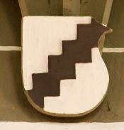 - Abb. 5: Netzrippenkonsole mit dem Wappen der Grafen von Werdenberg-Heiligenberg im Chor der St. Anna-Kapelle in Tettnang, hier fälschlicherweise mit schräglinkem statt mit schrägrechtem Stufenbalken dargestellt