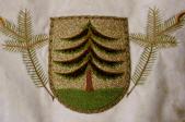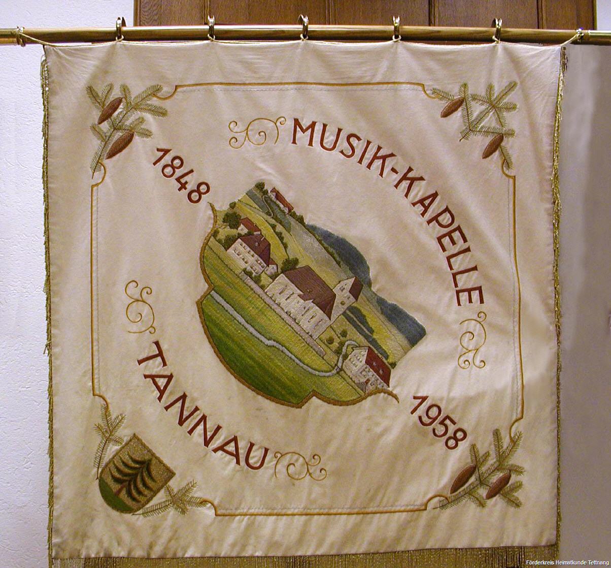 Zu seinem 110-jährigen Jubiläum gab der örtliche Musikverein 1958 eine neue Fahne in Auftrag (Abb. 2). Auf ihr ist erstmals ein Wappen mit einer Tanne abgebildet (Abb. 3). Ein solches Wappen, ergänzt um eine dreilatzige rote Fahne, wurde vom Gemeinderat als Gemeindewappen vorgeschlagen und der Kommune am 29. Juni 1961 vom Innenminister verliehen (Abb. 4). Die » Montfortfahne im vorderen Obereck verweist auf die Jahrhunderte währende Zugehörigkeit von Tannau zum Herrschaftsgebiet der Tettnanger Grafengeschlechts.