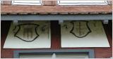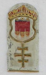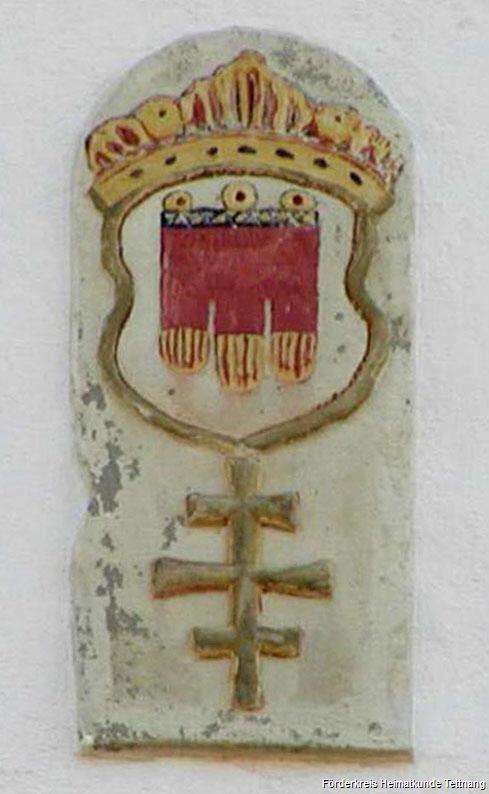 - Abb. 4: Eingemauerter Grenzstein in der Giebelwand des Tettnanger Hotels Rad zum Bärenplatz hin mit den Wappen der Grafen von Montfort (Hochgerichtsherren) und des Klosters Langnau (Niedergericht)