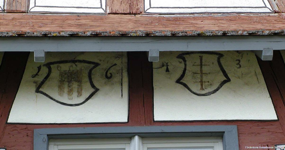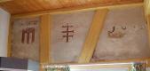 - Abb. 5 und 6: Wandbemalung am ehemaligen Kellhof des Klosters in Rappertsweiler (Haus Nr. 8) aus dem Jahre 1643 mit Montfort- und Klosterwappen