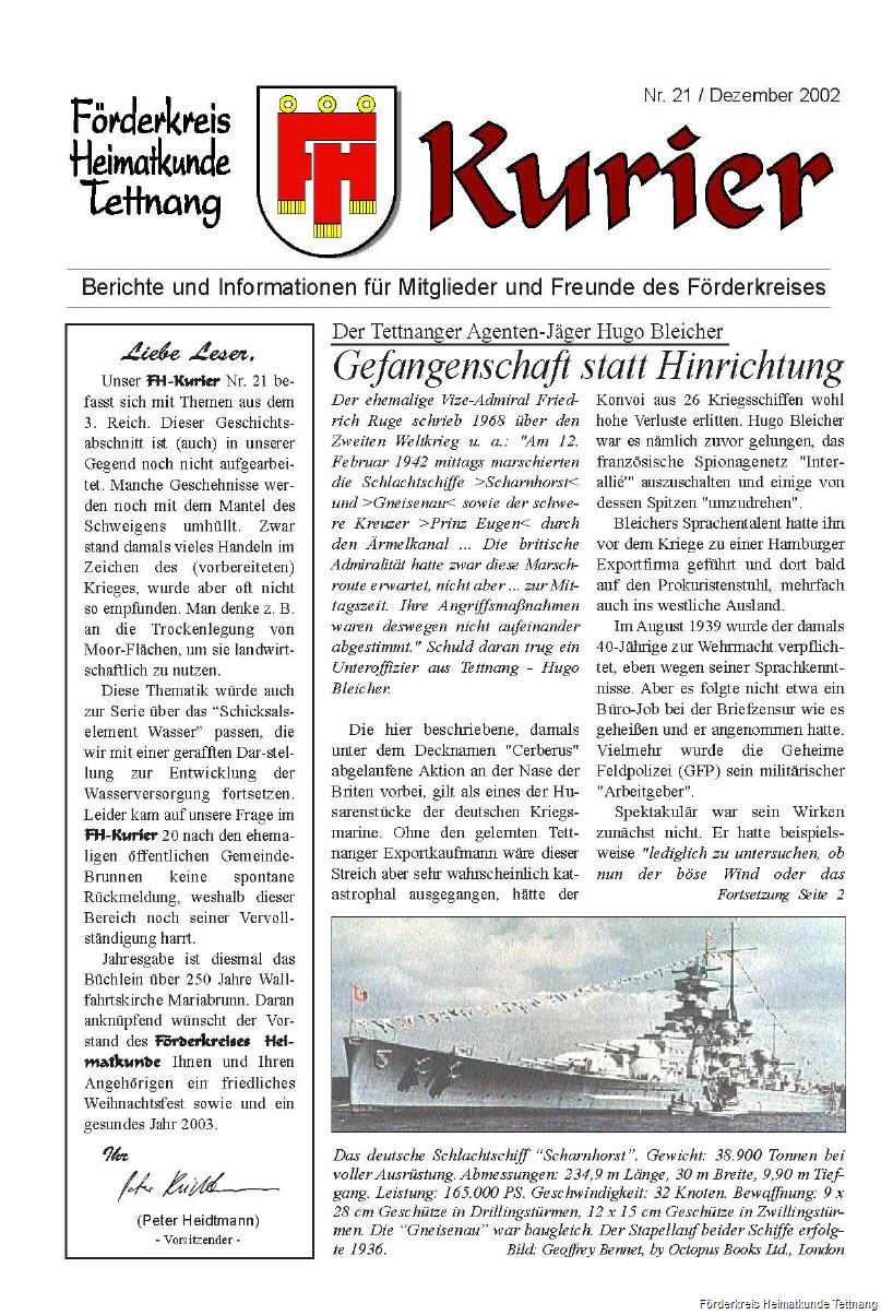 Gefangenschaft statt Hinrichtung - Der Tettnanger Agentenjäger Hugo Bleicher, der 1941/42 französische Spione „umdrehte“ und so den Durchbruch der Kriegsschiffe „Scharnhorst“ und „Gneisenau“ möglich machte. - Historische Stichworte zu „Mata Hari“, Funkpeilung, „Rote Kapelle“.