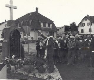 (v.l.n.r.): Die schmerzhafte Madonna befindet sich in gutem Zustand. Nachdem der Bildstock 1981 infolge eines Autounfalls zerstört worden war, erfolgte am 7. Juni 1984 erneut die Einweihung.