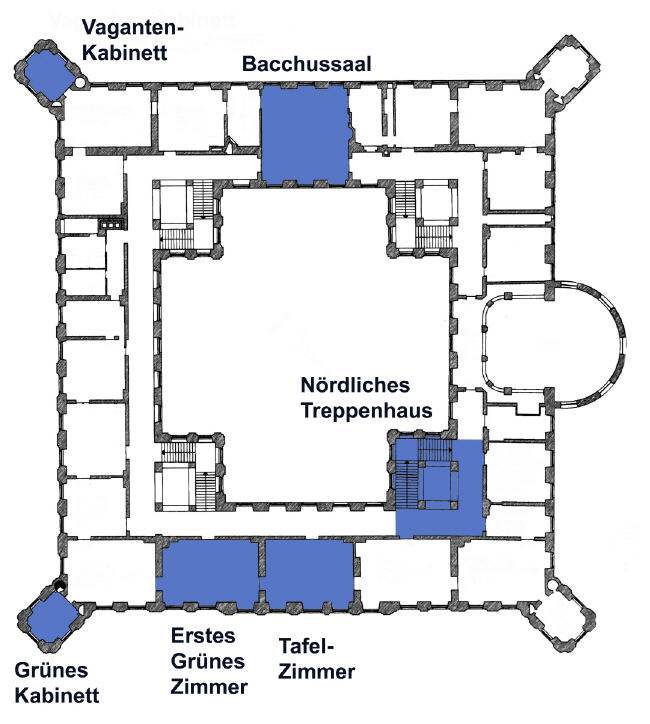 ![]() Grünes Kabinett - Die Ausstattung des Kabinetts mit seinem Deckenspiegel aus einem spiralartigen Stuck-Netz, den mit grünen Glasscheiben verkleideten Wänden, den zwei lebensgroßen Hermen und der Adler-Puttengruppe über der Eingangstür zählt zu den Meisterwerken Feuchtmayers.