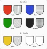 Dem ursprünglichen Zweck eines Wappens, ein weithin sichtbares Zeichen zu sein, entspricht die Verwendung von kräftigen und ungemischten Farben (Tinkturen), die kontrastreich anzuordnen sind. Die Heraldik beschränkt sich dabei nur auf die Grundfarben Rot, Blau, Grün und Schwarz sowie auf die „Metalle“ Gold und Silber, die durch Gelb und Weiß dargestellt werden. „Naturfarbe“ ist für unbedeckte Körperteile erlaubt; Purpur und Braun werden „geduldet“. Eine weitere Besonderheit ist die Darstellung von Pelzwerk im Sinne einer Farbe. |