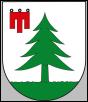 In Silber auf grünem Boden eine grüne Tanne, begleitet von einer dreilatzigen roten Fahne an drei schwarzen Trageringen |