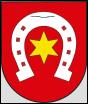 In Rot ein silbernes Hufeisen, darin ein goldener, sechsstrahliger Stern. |
