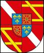 Geviert; 1. und 4. Feld: in Rot ein silberner Schrägrechtsbalken, 2. und 3. Feld: in Rot je eine goldene Kopf-, Fuß- und Schrägrechts-leiste. Belegt mit geviertem Herzschild; 1. und 4. Feld: in Blau drei goldene Lilien, 2. und 3. Feld: in Rot ein goldenes Kettennetz . |