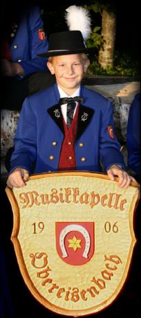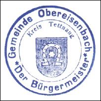 Ein Siegel des Herrn Hans von Eisenbach zu Obermeckenbeuren von 1447 ist überliefert und zeigt einen Schild mit Hufeisen und einem Stern in der Mitte. Auf dem Helm ruht ein Kissen, auf dem sich der Schildinhalt gespiegelt wiederholt (Abb. 1). Farben sind nicht bekannt. Kurz vor der Aufgabe ihrer Selbständigkeit übernahm die frühere Gemeinde Obereisenbach Mitte der 1930er Jahre das Wappenbild des ehemaligen Ortsadels mit Farben, die der frühere Stadtarchivar von Tettnang Dr. Alex Frick vorgeschlagen hatte: In Rot ein silbernes Hufeisen mit einem goldenen sechsstrahligen Stern in der Mitte (Abb. 2). Zu einer offiziellen Wappenverleihung ist es aber nicht mehr gekommen, obwohl der Bürgermeister das Wappen in seinem Siegel geführt hat (Abb. 3). Als die Musikkapelle Obereisenbach 1936 eine neue Fahne beschaffen wollte, übernahm sie das Gemeindewappen in den vorgeschlagenen Farben und besitzt damit ein ansprechendes Emblem, das zum einen an die Herren von Eisenbach, zum anderen an die frühere Selbständigkeit von Obereisenbach erinnert (Abb. 4). |