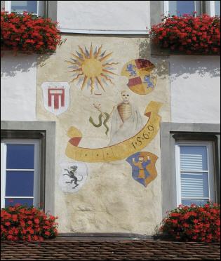 Am Torschloss in Tettnang zum Bärenplatz hin ist das Wappen der früheren Besitzer, der Familie Leuthold abgebildet (Abb. 2). Es entspricht in Form und Farbgebung allerdings nicht vollständig der Beschreibung im Wappenbuch der Reichskanzlei und der Beschreibung im Oberbadischen Geschlechterbuch, sondern zeigt in Blau-Gold gespaltenem Feld einen Mannrumpf mit angewinkelten Armen und einem Kleid in verwechselten Farben (Abb. 3). Weitere Quellen, die über die Richtigkeit der Ausführung Auskunft geben könnten wurden bisher nicht gefunden.