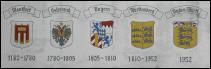 Herzog Eberhard Ludwig ergänzte das württembergische Wappen Anfang des 18. Jahrhunderts mit dem Schildbild der Herrschaft Heidenheim: In Gold das Brustbild eines bärtigen Mannes mit roter, blau-gestülpter Mütze und rotem Gewand mit silbernem Kragen (Abb. 6). Herzog Karl Eugen nahm um 1785 die Schilde neu erworbener Gebiete in das württembergische Wappen auf. 1751 war die Herrschaft Justingen gekauft worden (In Blau ein schräger geästeter silberner Balken). 1780-82 erwarb Württemberg mehrere Teile der Reichsgrafschaft Limpurg (Geviert; 1. und 4. Feld rot mit drei silbernen Spitzen; 2. und 3. Feld blau mit fünf (3:2) silbernen Kolben). Die Herrschaft Böningen gelangte 1784 an das Haus Württemberg (In Rot ein liegender silberner Halbmond) (Abb. 7).