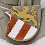 In der St. Anna-Kapelle befindet sich das Wappen der Grafen von Görz auf einer Netzrippenkonsole im Chorraum rechts in der Ecke zum Langhaus hin (Abb. 1). Es ist schrägrechts geteilt mit einem goldenen schreitenden Löwen im oberen blauen Feld und zwei roten Schräglinksbalken im unteren silbernen Feld. Die Helmzier des gräflichen Vollwappens (Abb. 2) zeigt auf dem gekrönten Helm einen schwarzen Hut mit Hermelinkrempe, der mit drei Pfauenfedern besteckt ist. Die Helmdecke ist vorne rot-silbern und hinten blau-golden. |