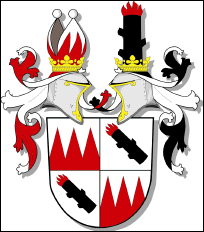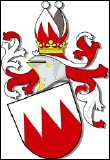 Das Stammwappen der Grafen von Sulz zeigt im silbernen Schild drei aufsteigende rote Spitzen. Auf dem gekrönten Helm ragt ein Bischofshut mit dem Schildbild. Die Helmdecke ist Silber-Rot (Abb. 1).