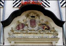 Johann X. (nach anderer Zählweise der VIII.) von Montfort heiratete 1655 Maria Eusebia von Königsegg-Aulendorf, die bereits 1656 starb. 1658 verehelichte er sich mit Maria Katharina, der Tochter des Landgrafen im Klettgau, Karl Ludwig von Sulz. 1667 ließ er als neue Residenz das sogenannte Alte Schloss, das heutige Rathaus von Tettnang errichten und über dem Portal drei hochovale Wappen in gerollten Kartuschen anbringen: in der Mitte unter einer Krone das Wappen der Grafen von Montfort, links das Wappen der Grafen von Königsegg und rechts das der Grafen von Sulz (Abb. 4). Das Allianzwappen weist allerdings zwei kleine Fehler auf. Zum einen muss die Farbe der Rauten im Königsegger Schild neben rot golden (oder gelb) sein. Zum anderen gehört der goldene Schildbord nicht in das Wappen von Brandis.