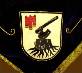 Da Kau politisch nie selbständig war, hatte es infolgedessen auch kein Anrecht auf ein eigenes Wappen. Der 1975 gebildete Ortschaftsverband hatte jedoch das Selbstbewusstsein derart gestärkt, dass sich der Ortschaftsrat für die Schaffung eines eigenen Wappens aussprach. Zur Jubiläumsfeier „Zehn Jahre Ortschaft Kau“ am 11. März 1985 wurde das neue Wappen vorgestellt (Abb. 2). Baumstumpf und Beil deuten auf die Rodung hin, aus der Kau selbst und sein Name hervorgegangen sind. Die rote Fahne erinnert an die frühere Zugehörigkeit des Ortes zur Grafschaft Montfort. Die Farben Schwarz/Silber sind auch die Stadtfarben von Tettnang und damit gleichzeitig ein Hinweis auf die heutige Zugehörigkeit von Kau. Der Wappeninhalt wurde parallel von Peter Franzen und Gisbert Hoffmann vorgeschlagen, die Ausführung stammt von letzterem. Das Wappen hat keinen offiziellen Charakter, da nach der Gemeindeordnung des Landes Baden-Württemberg nur selbständige Kommunen wappenfähig sind. |